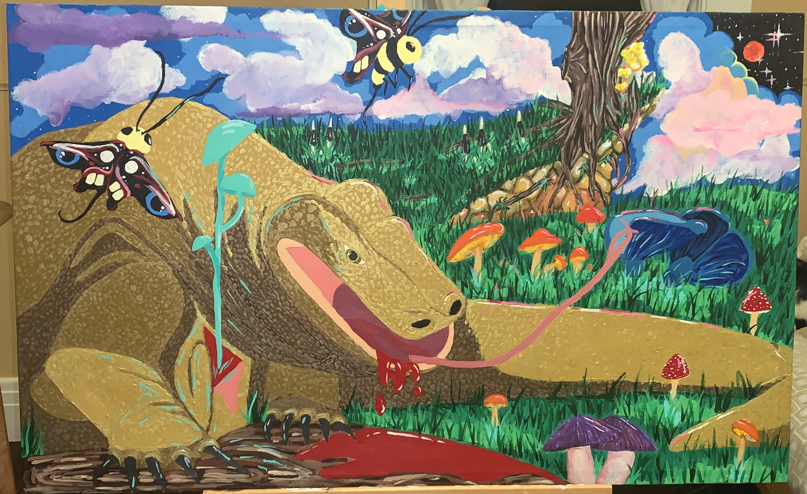 Created this piece for my cousin who is the Golden Dragon in the Chinese Zodiac. The Komodo Dragon is a fierce and powerful reptile, and here in this piece symbolically represents an overly inflated ego. But when one becomes aware to the profound divinity of our greater world surrounding us, that ego is infected and begins a death cycle. This piece has a special pace in my heart, and as the years move forward the meaning and complexity of this work morphs and shifts like a kaleidoscope.