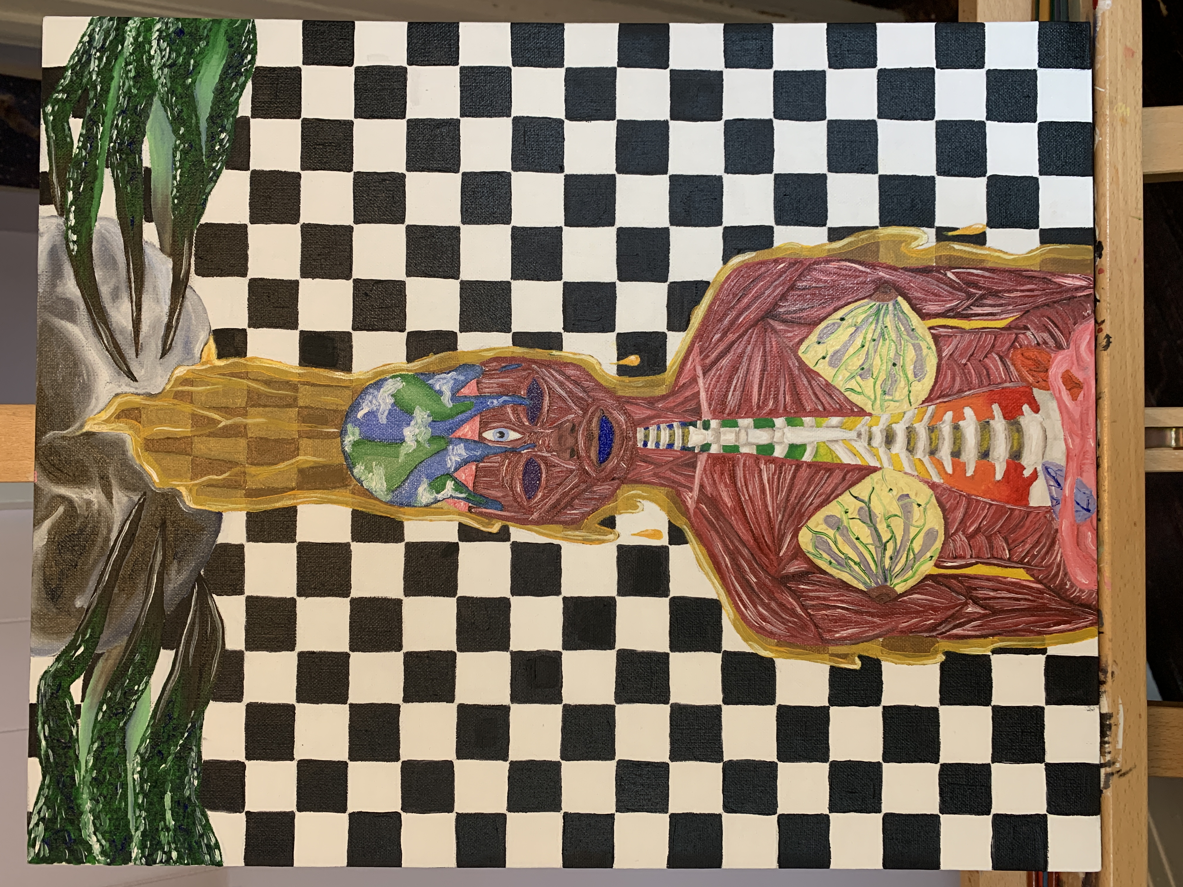 Like all my work, I am slow and steady like the turtle, but I always persevere and eventually come to a conclusion. I love this piece and did not realize when I first sketched and began painting that this figure was me. She rests against the backdrop of the black and white checker board, stuck in black and white thinking, further trapped in this amber goo pouring from a reptilian moon, cracked open and dropping the material earthly realm straight on our protagonists mind. If you are familiar with David Icke the reference should be fairly clear. While the image can evoke horror as the main character’s flesh is completely pulled back leaving her exposed and bare with her guts spilling out, there is still a bright side. If you take a closer inspection at her center spinal column you will notice the ascending chakra colors leading to her third opening. For even in our greatest darkness and state of mind control, all one has to do to regain power is wake up, become aware of their bindings, and take action. That is how you escape the Matrix.